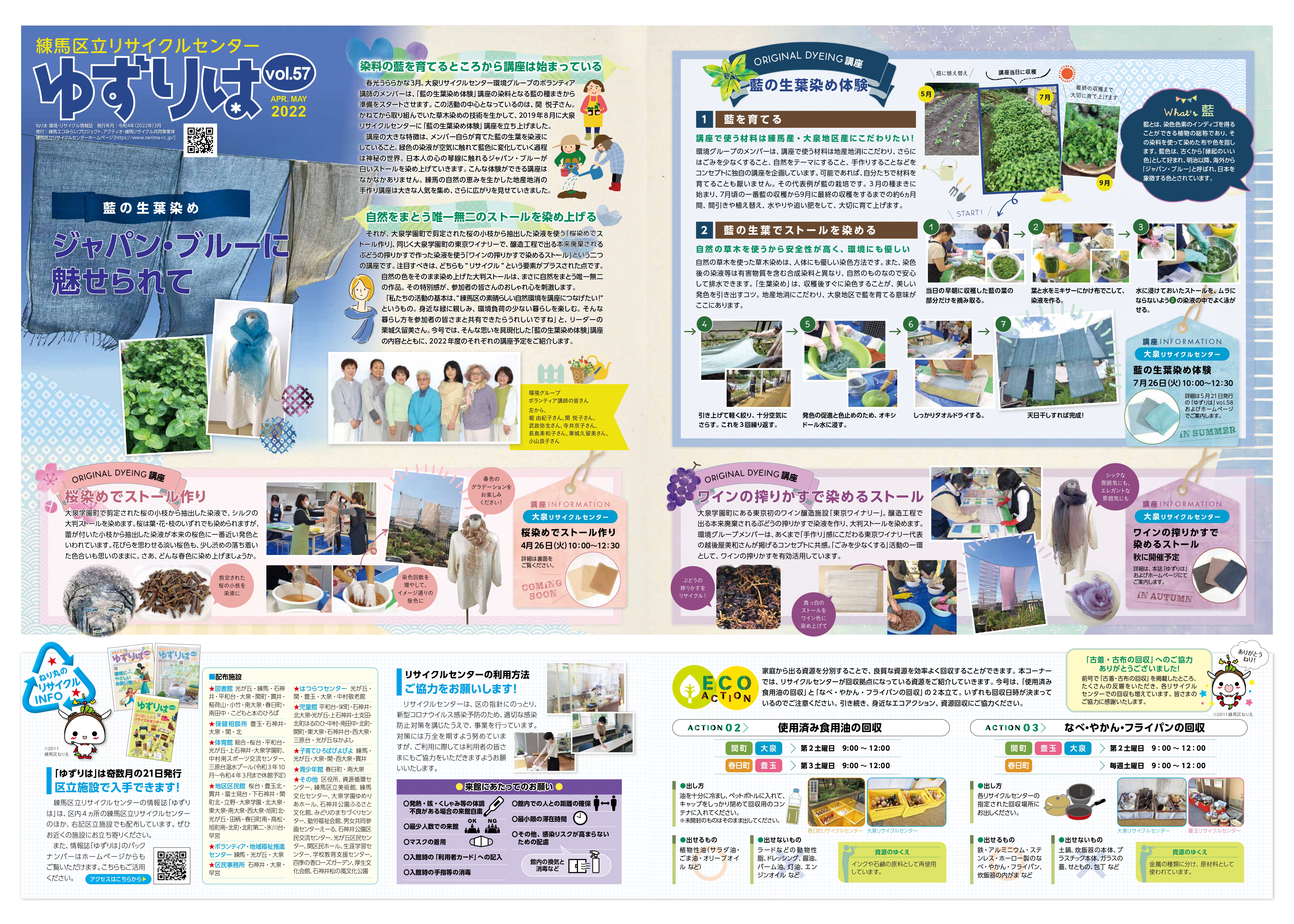 春光うららかな3月。大泉リサイクルセンター環境グループのボランティア講師のメンバーは、「藍の生葉染め体験」講座の染料となる藍の種まきから準備をスタートさせます。講座の大きな特徴は、メンバー自らが育てた藍の生葉を染液にしていること。緑色の染液が空気に触れて藍色に変化していく過程は神秘の世界。日本人の心の琴線に触れるジャパン・ブルーが白いストールを染め上げていきます。今号では、そんな思いを具現化した「藍の生葉染め体験」講座の内容とともに、2022年度のそれぞれの講座予定をご紹介します。