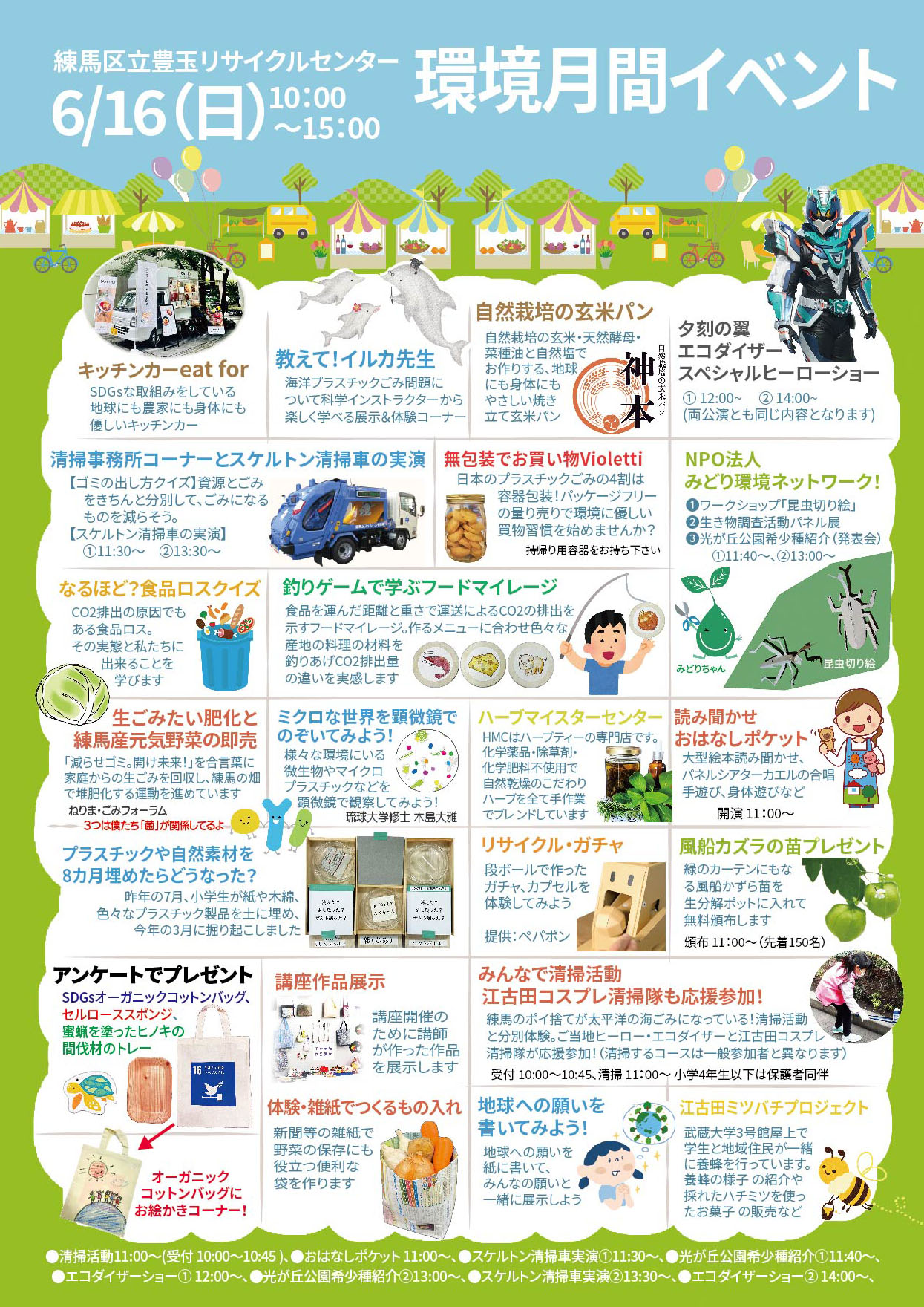 地球温暖化防止につながる「食品ロスの削減」「生ごみたい肥」「無包装ショップ」「自然素材を使ったクラフト」「身近な緑や生態系の保全」「分別のすすめ」「自給率の優等生お米をおいしく食べる」「規格外野菜のキッチンカー」、自然のプラスチック汚染を考える「教えて!イルカ先生」「海プラごみのこと」「清掃活動」など、当日は、イベント応援で「夕刻の翼エコダイザー」「江古田コスプレ清掃隊」も参加予定です。