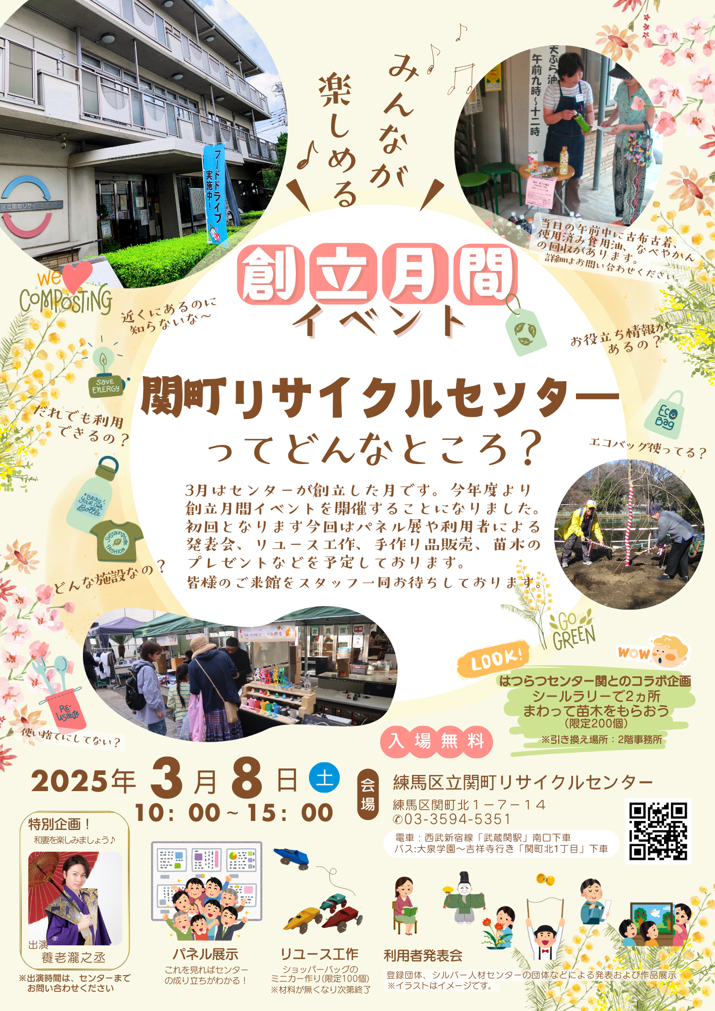 3/15は創立記念日です。今年度より創立月間イベントを開催することになりました。初回となります今回はパネル展や利用者による発表会、リユース工作、手作り品販売、苗木のプレゼント(限定200個)などを予定しております。