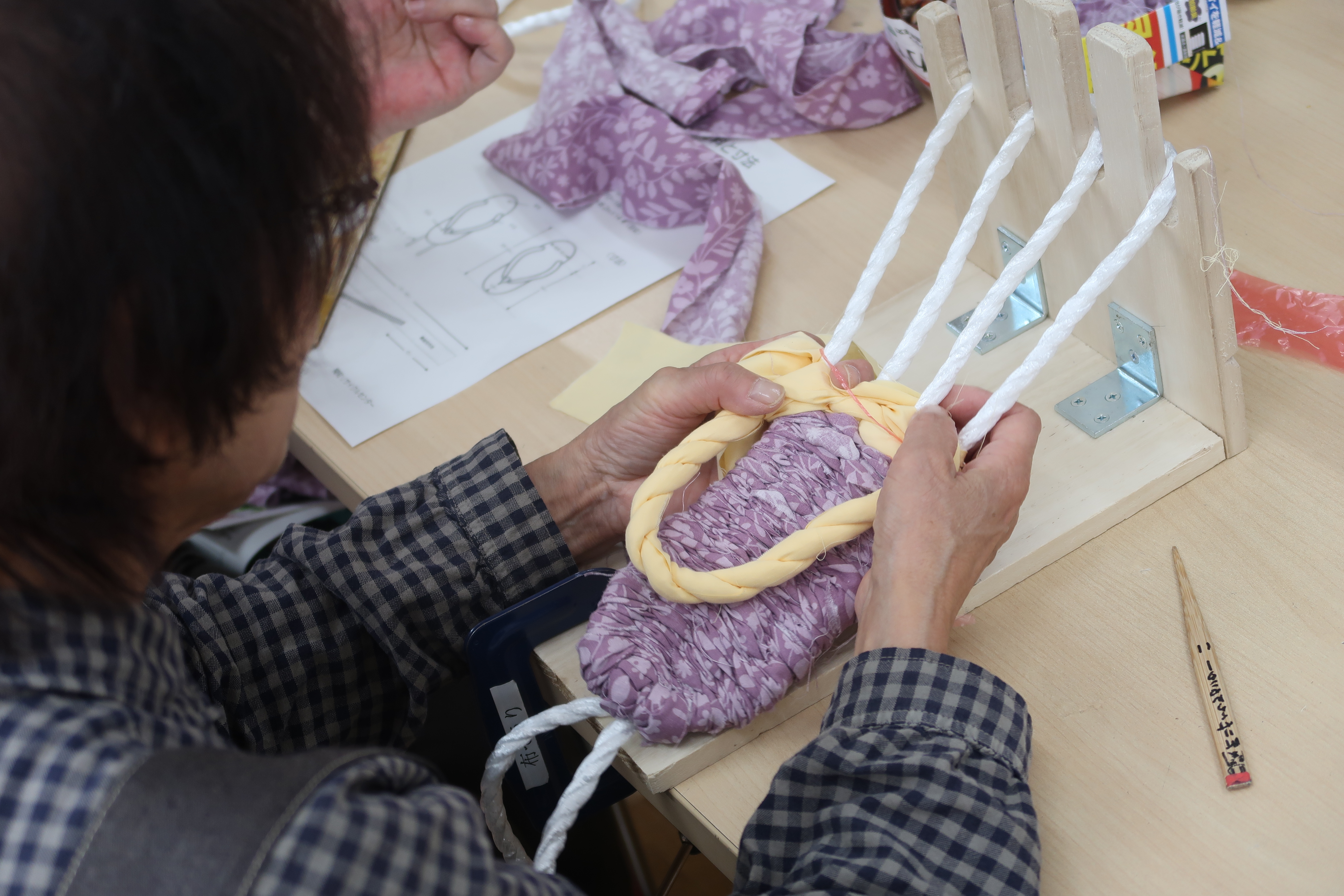 古くなった布地を裂いて、心地よいぞうりを作ります。(一足を2回で作ります)