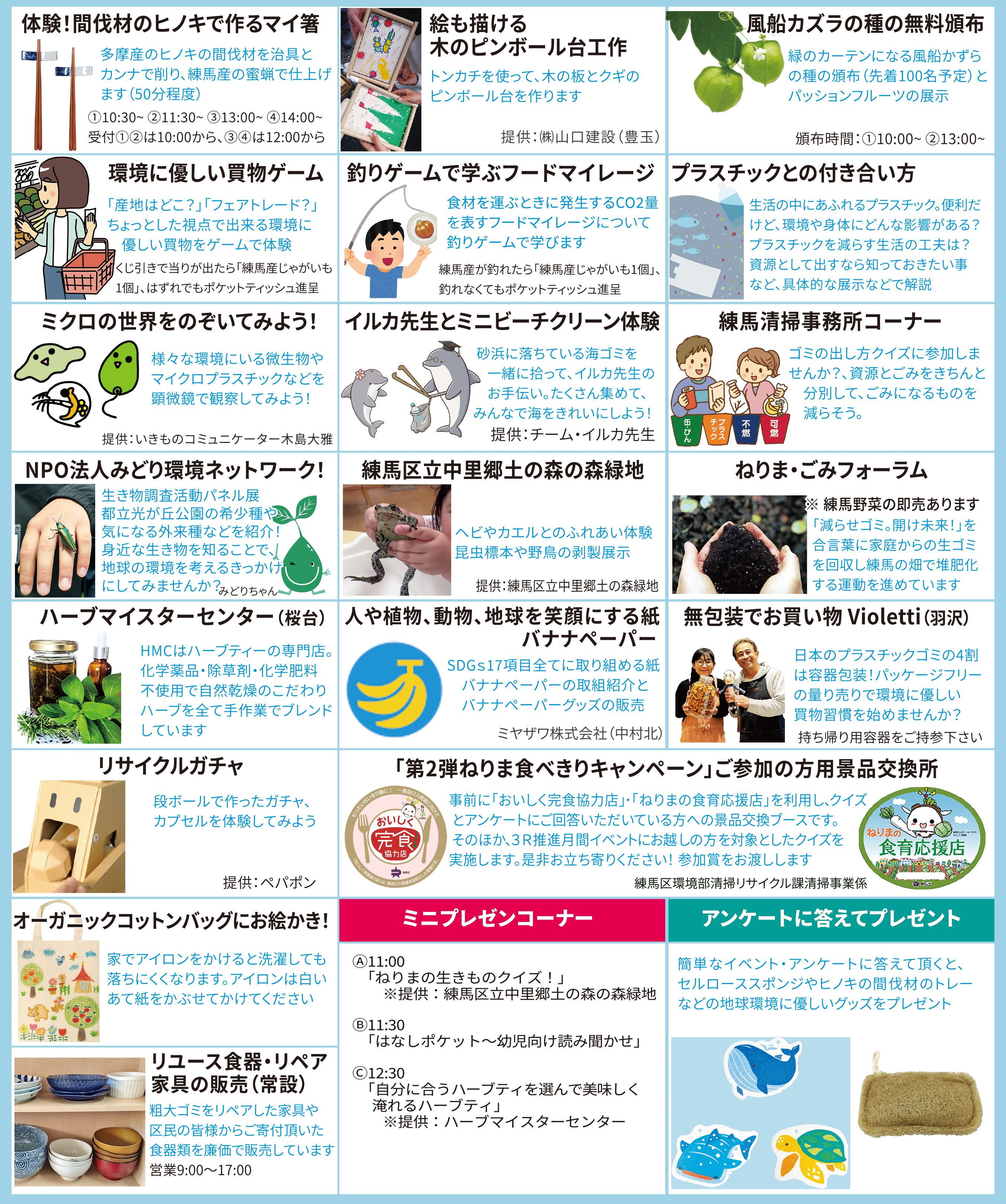 地元商店街「フードフェスタ」とのコラボ、釣りゲームフードマイレージ、買物ゲーム、ヒノキのマイ箸や木のピンボール台木工作、顕微鏡でミクロの世界観察 など